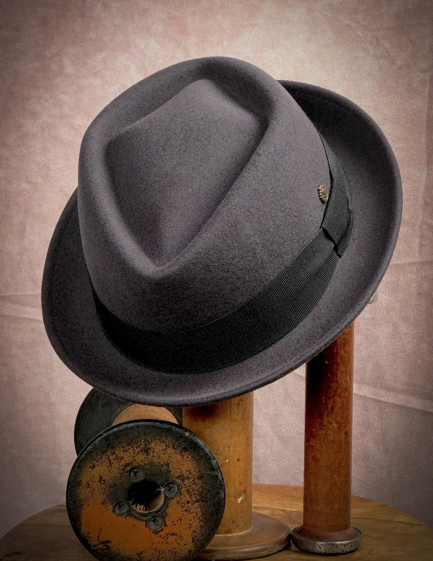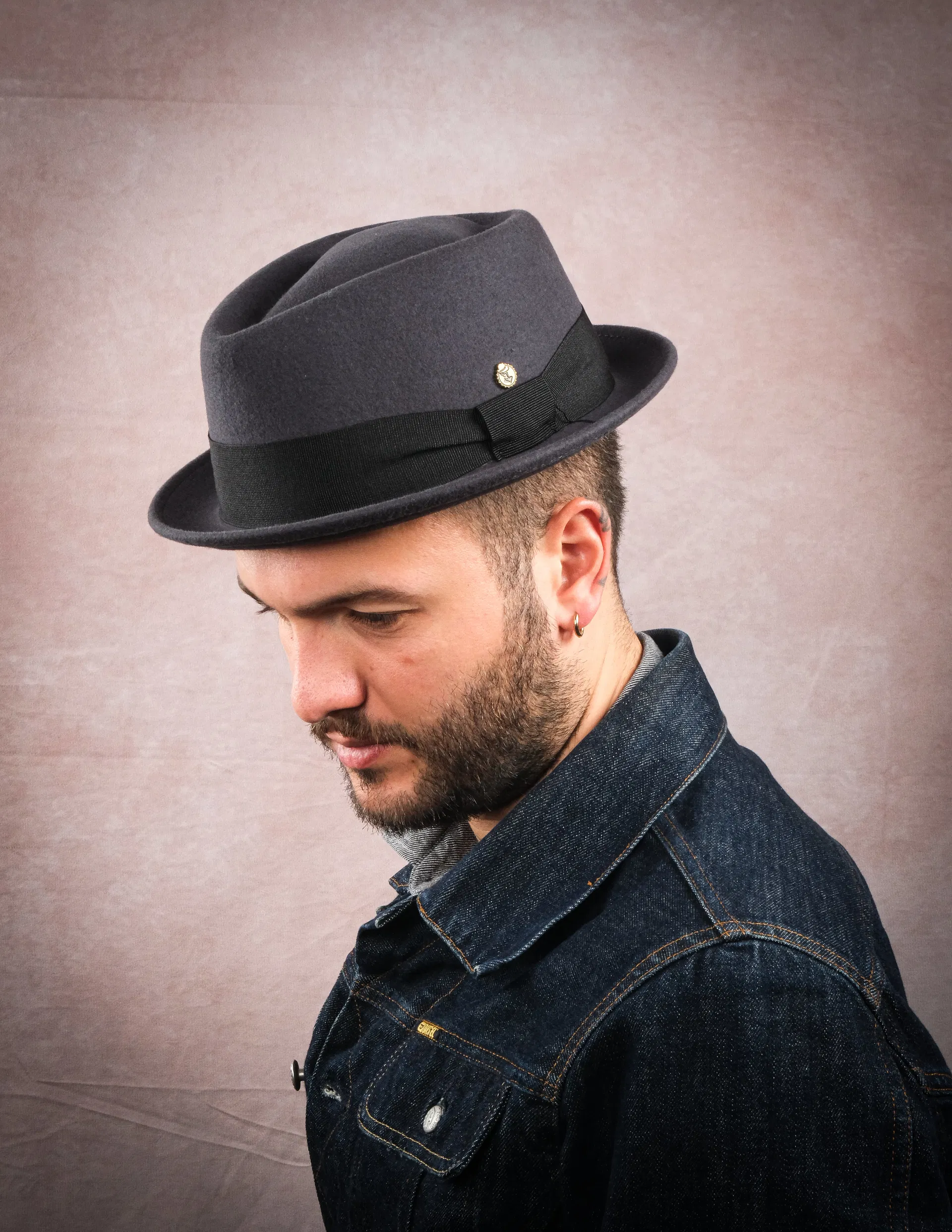 Unisex Filzhut in dunkelgrau mit Diamond Pressung und edler Stoffschärpe, wasserabweisend und rollbar.