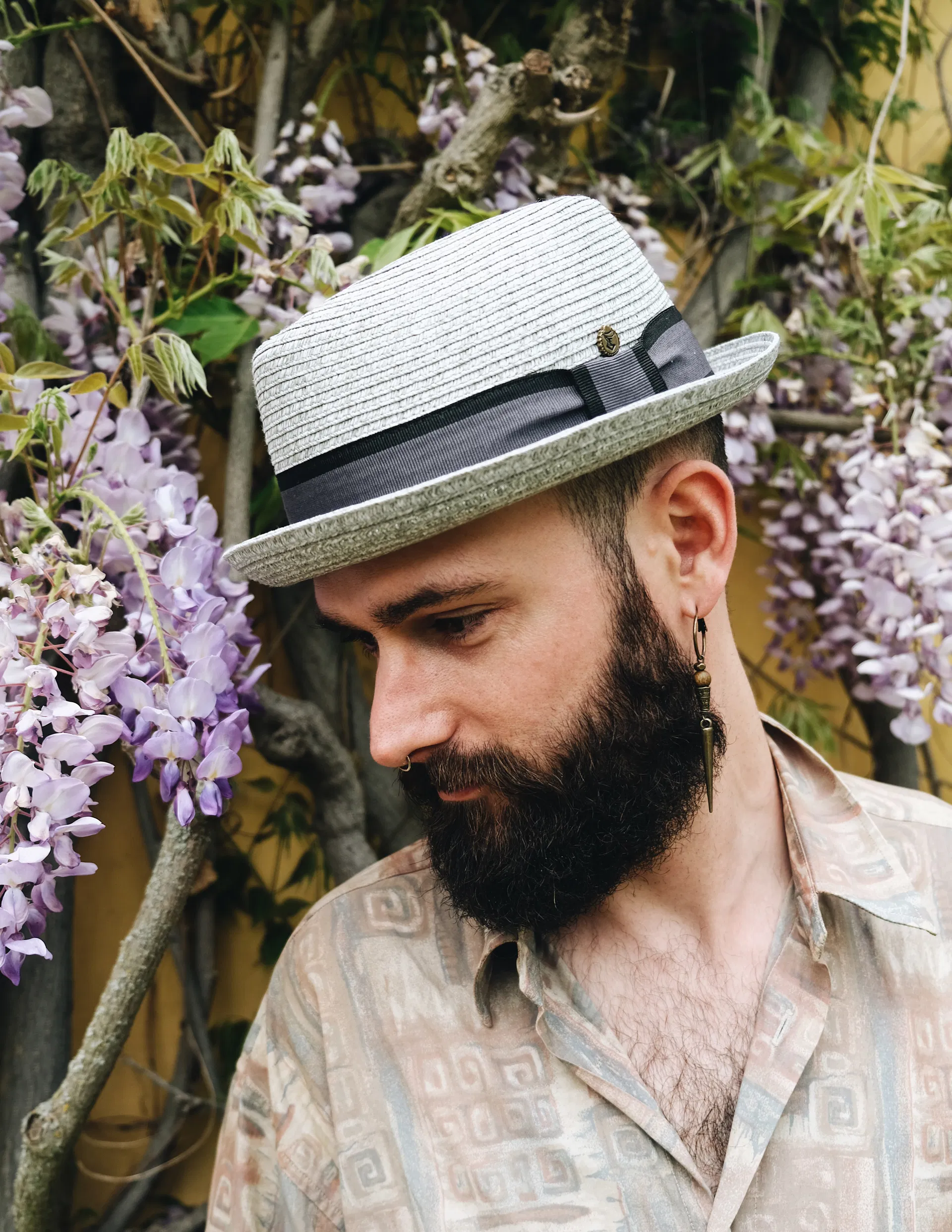 Unisex Diamond Pork Pie Strohhut in hellgrau, umlegt mit einer graublauen Hut-Schärpe in Seidenoptik.