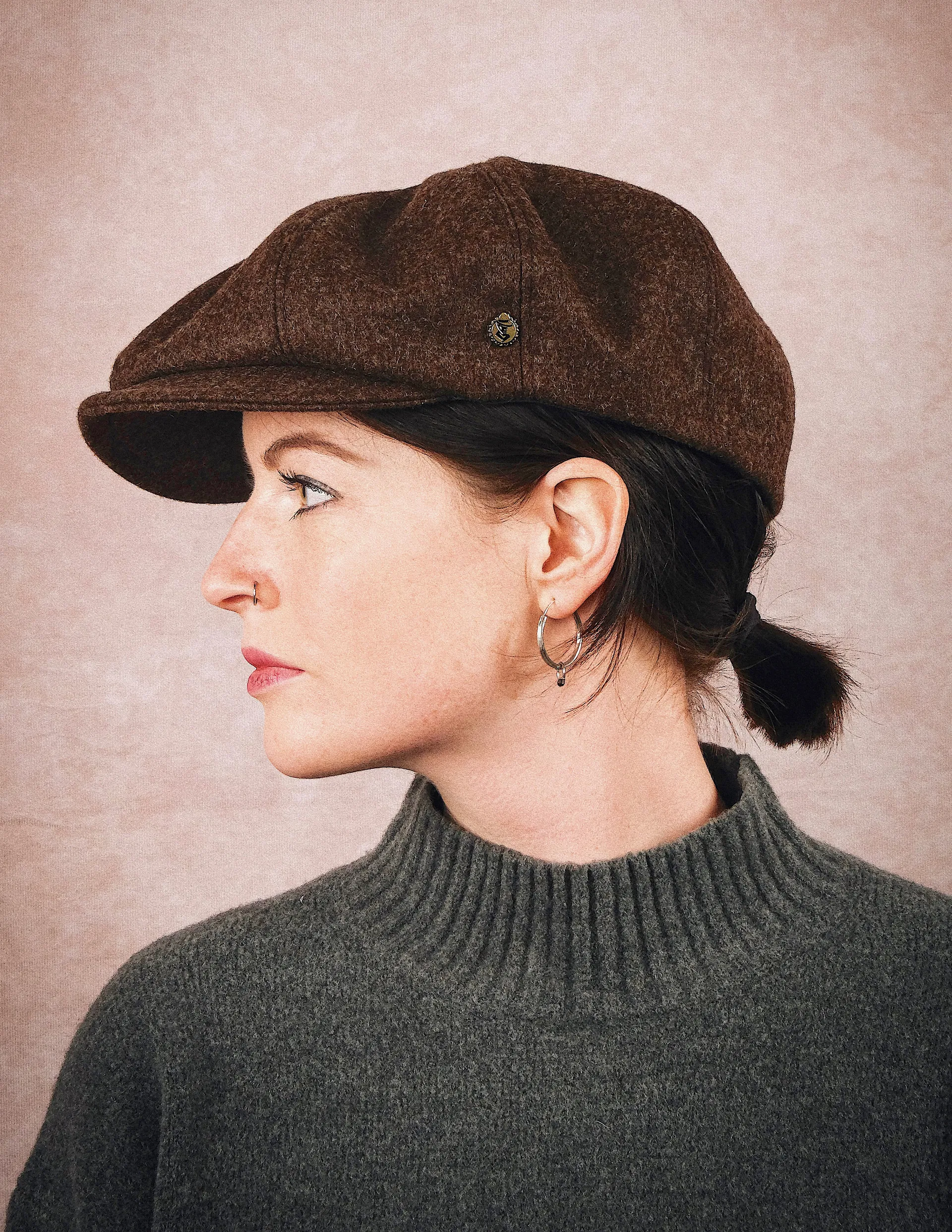 Handmade Unisex Bakerboy Schiebermütze in braun, gefertigt aus 100% Merino Wolle. Ein Naturprodukt, das wasserabweisend, atmungsaktiv, temperaturausgleichend, robust und trotzdem sehr strapazierfähig ist.