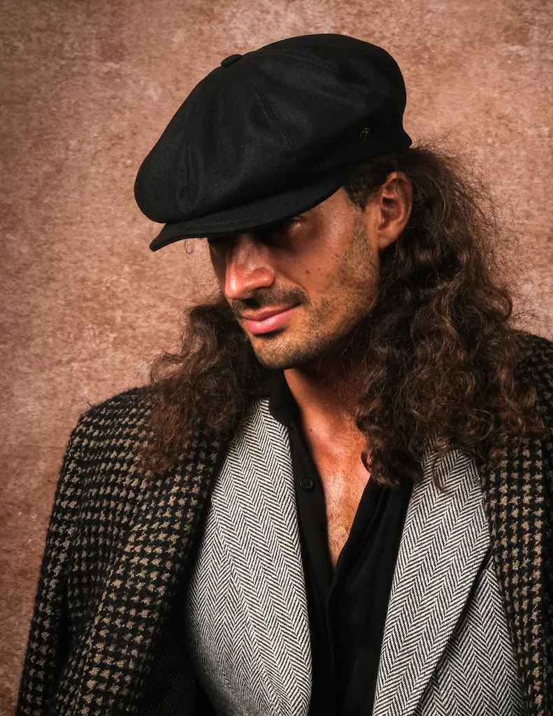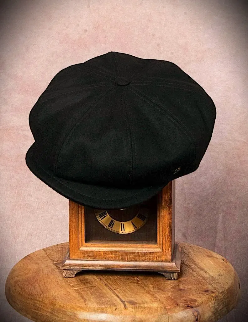 Handmade Unisex Bakerboy Schiebermütze in schwarz, gefertigt aus 100% Merino Wolle. Ein Naturprodukt, das wasserabweisend, atmungsaktiv, temperaturausgleichend, robust und trotzdem sehr strapazierfähig ist.