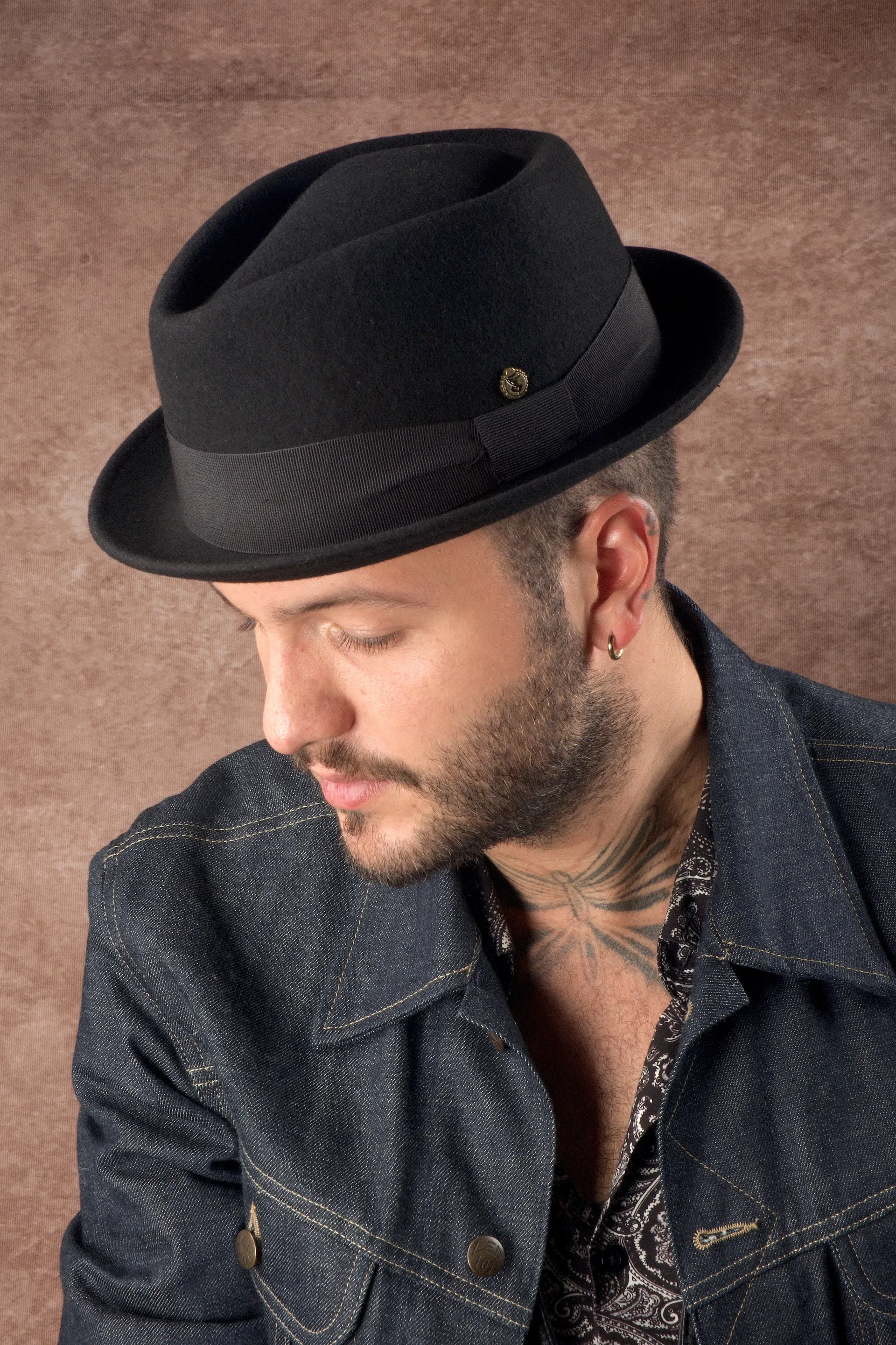 Unisex Filzhut in schwarz mit Diamond Pressung und edler Stoffschärpe, wasserabweisend und rollbar.