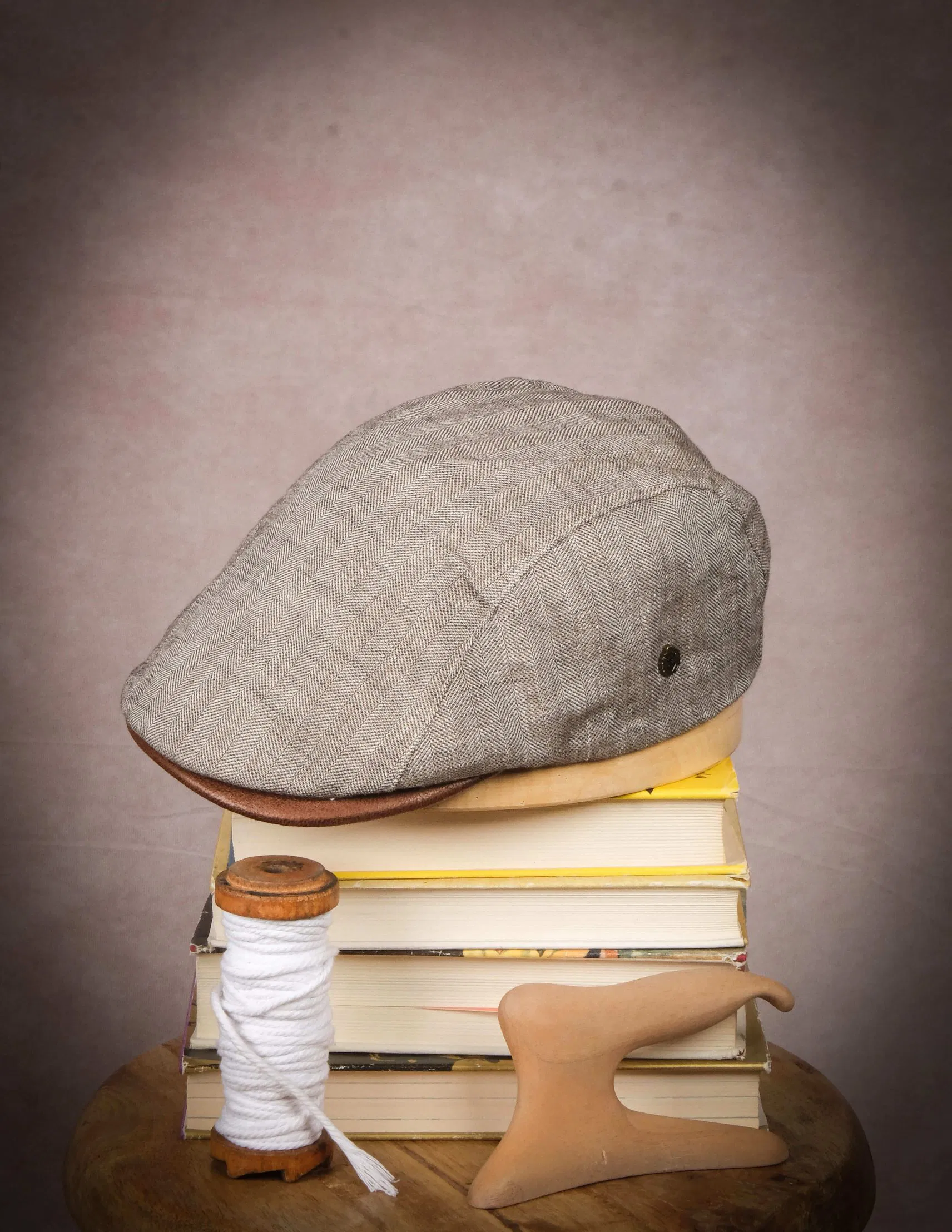 Klassische Herren Schiebermütze aus leichtem Leinen in beigegrau und braunem Schirm.