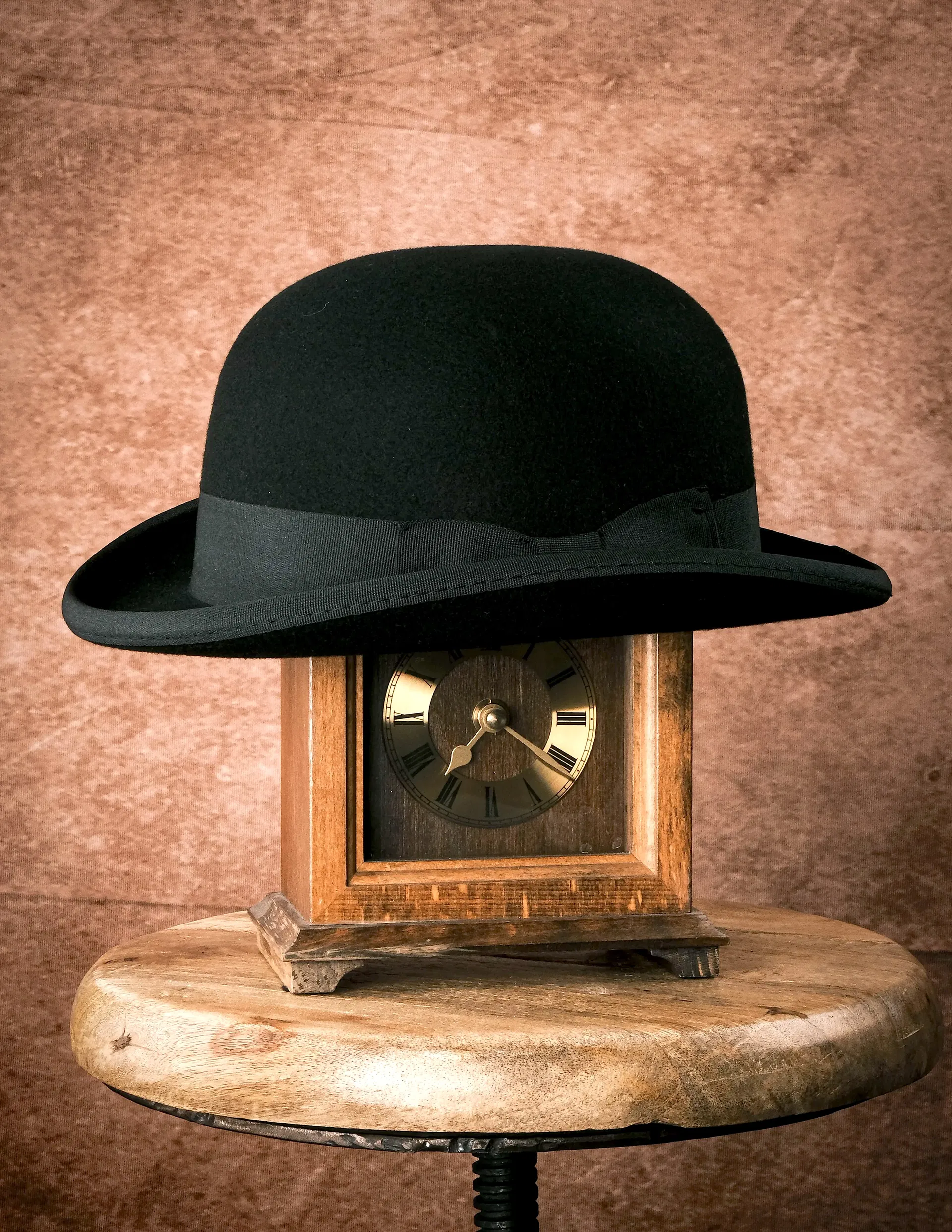 Handgemachter Unisex Melonenhut Bowler in schwarz, aus Wollfilz mit geschwungener Krempe und Zierschärpe.