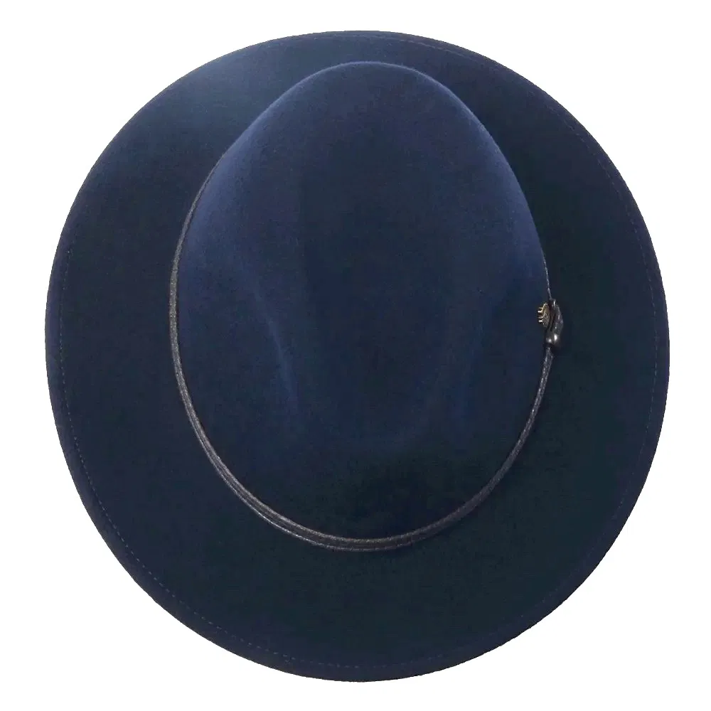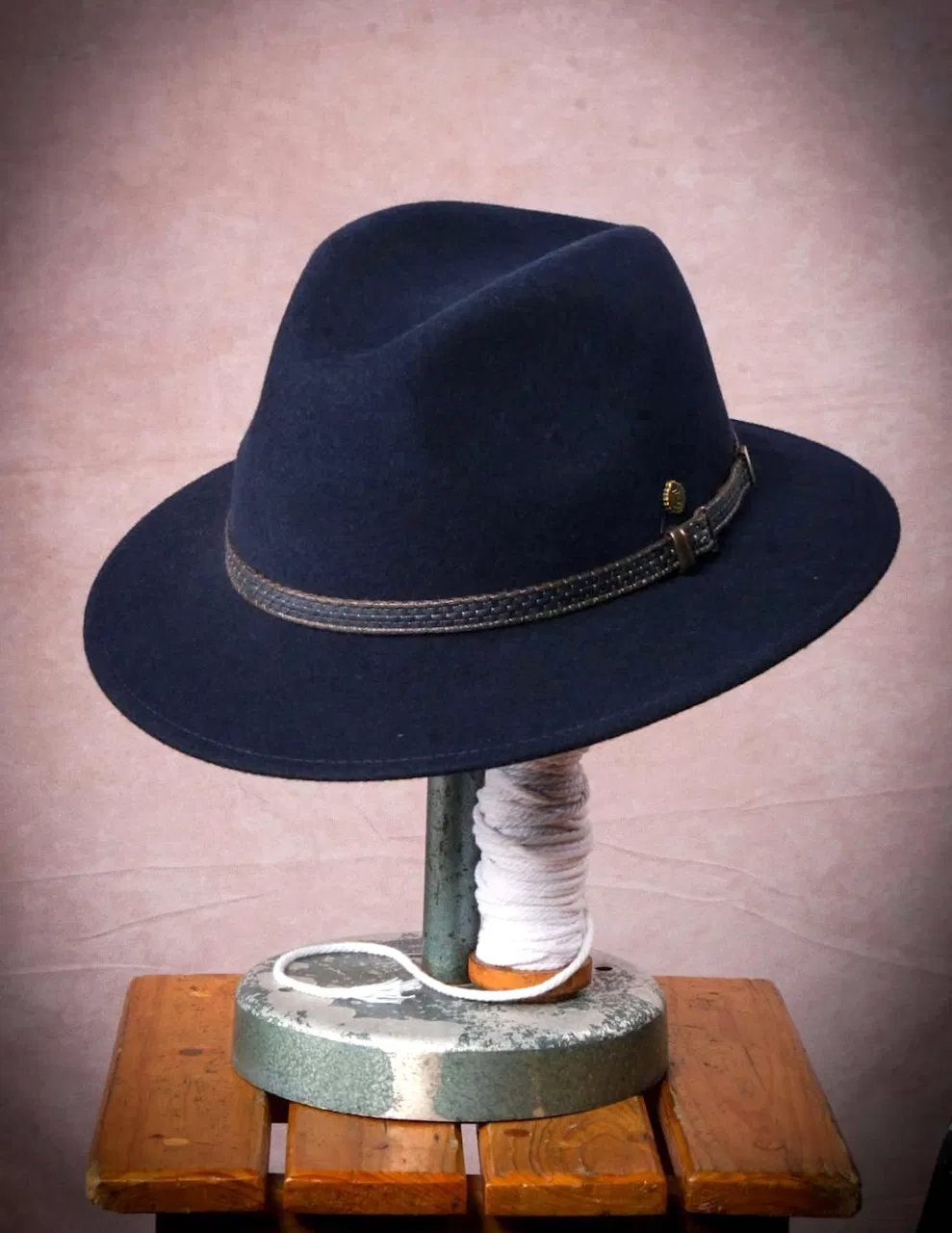 Unisex Fedora Outdoorhut aus Wollfilz in marine mit Lederschärpe, wasserdicht und rollbar.