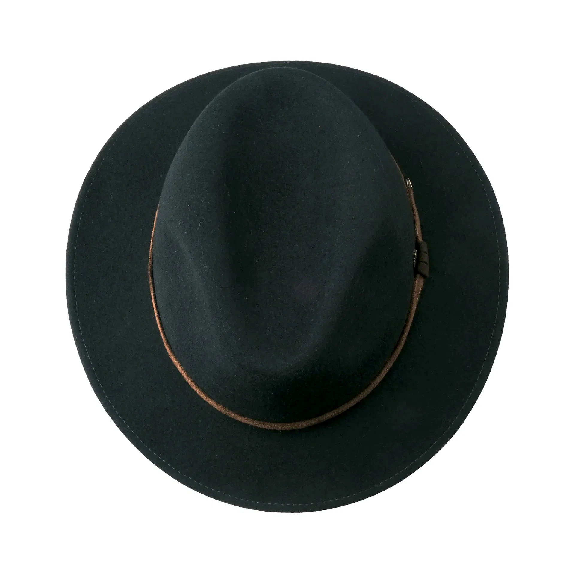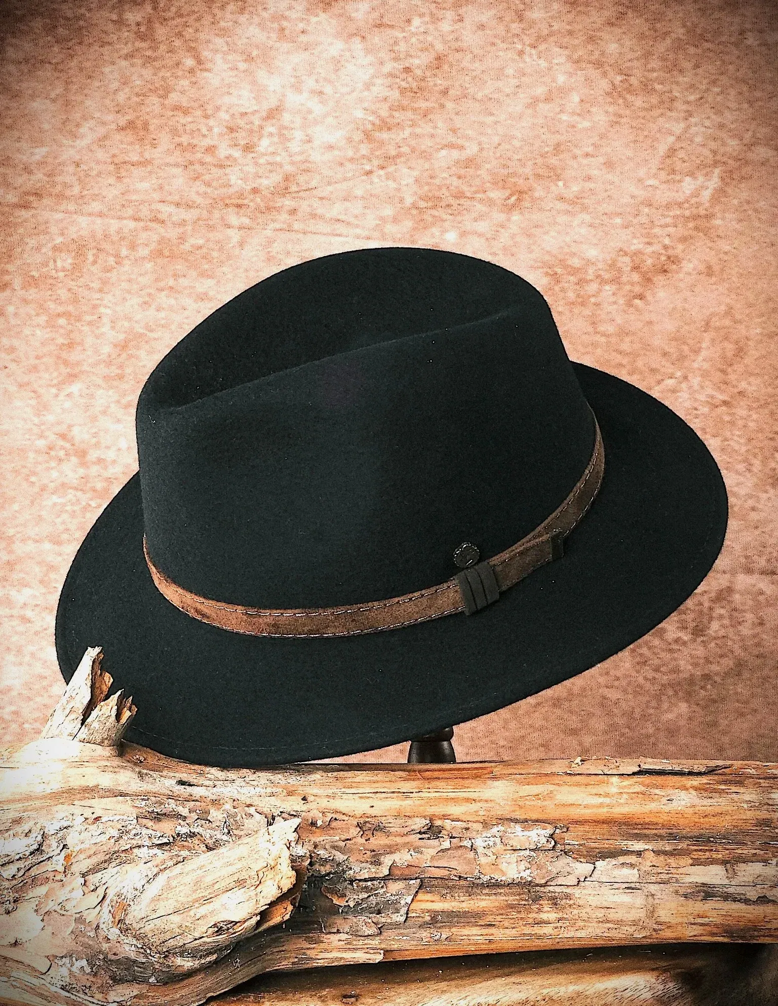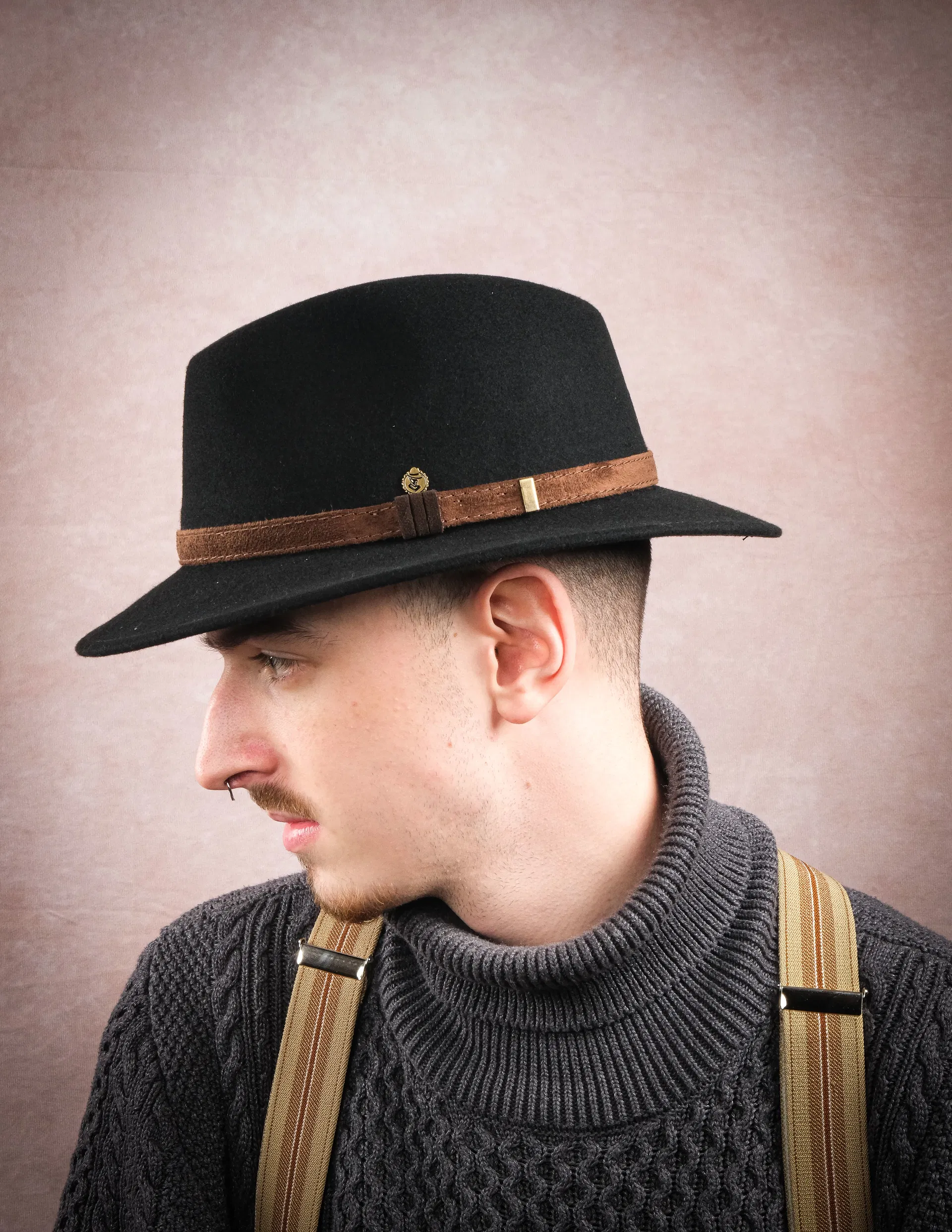 Unisex Fedora Outdoorhut aus Wollfilz in schwarz mit brauner Lederschärpe, wasserdicht und rollbar.