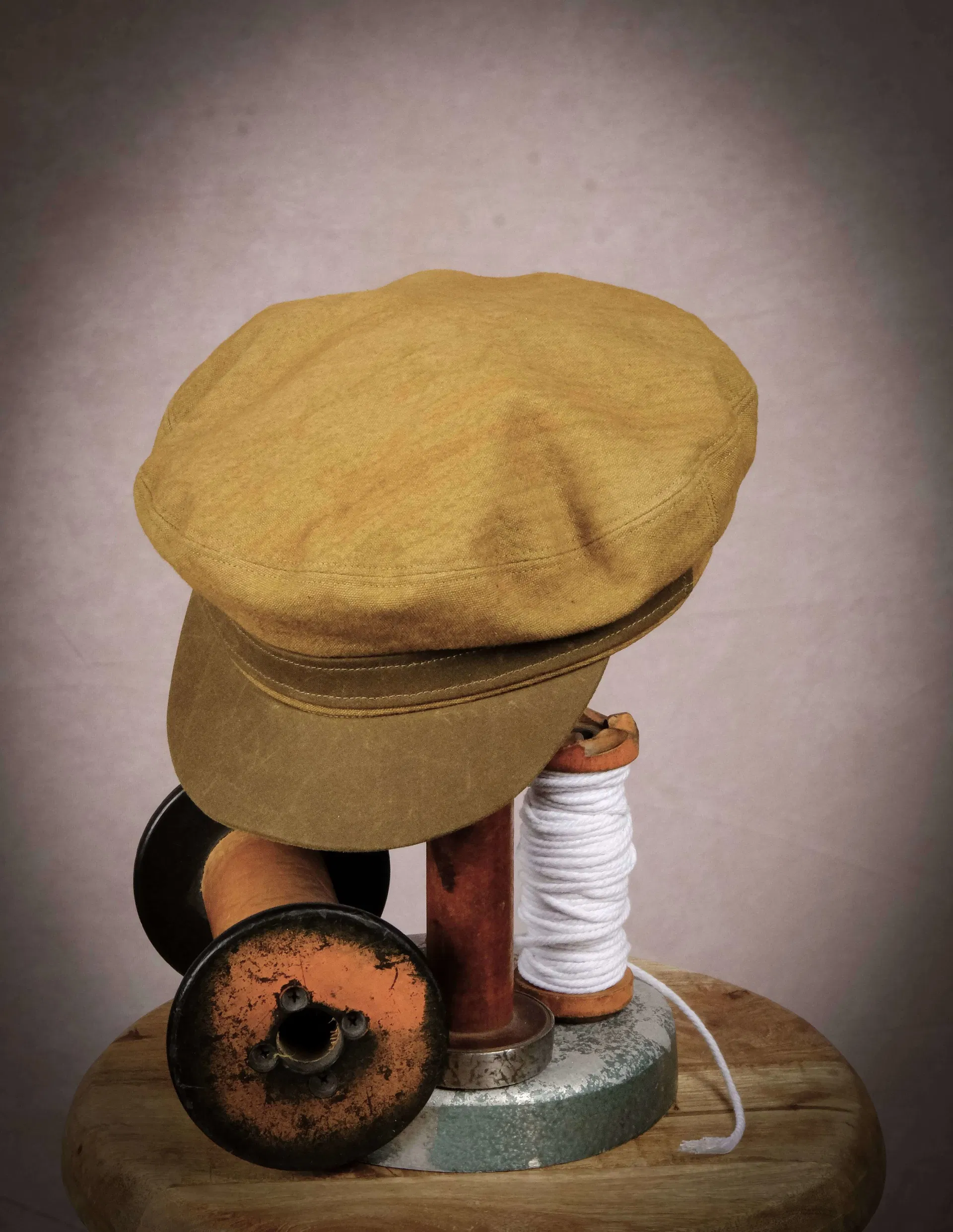 Maßanfertigung aus Berlin - Fertigung 2-3 Wochen Unisex Elbsegler Mütze aus robuster Baumwolle in vintage gold mit Schirm und Steg aus gewachster Baumwolle in braun.
