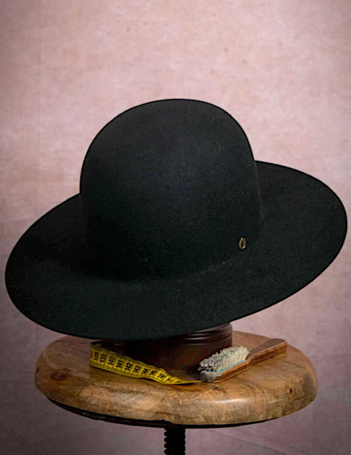 Handmade Unisex Settler-Hat Bonnie in schwarz aus Glatthaarfilz mit breiter, gerader Krempe, hohem, runden Kopf mit ohne Schnick-Schnack.