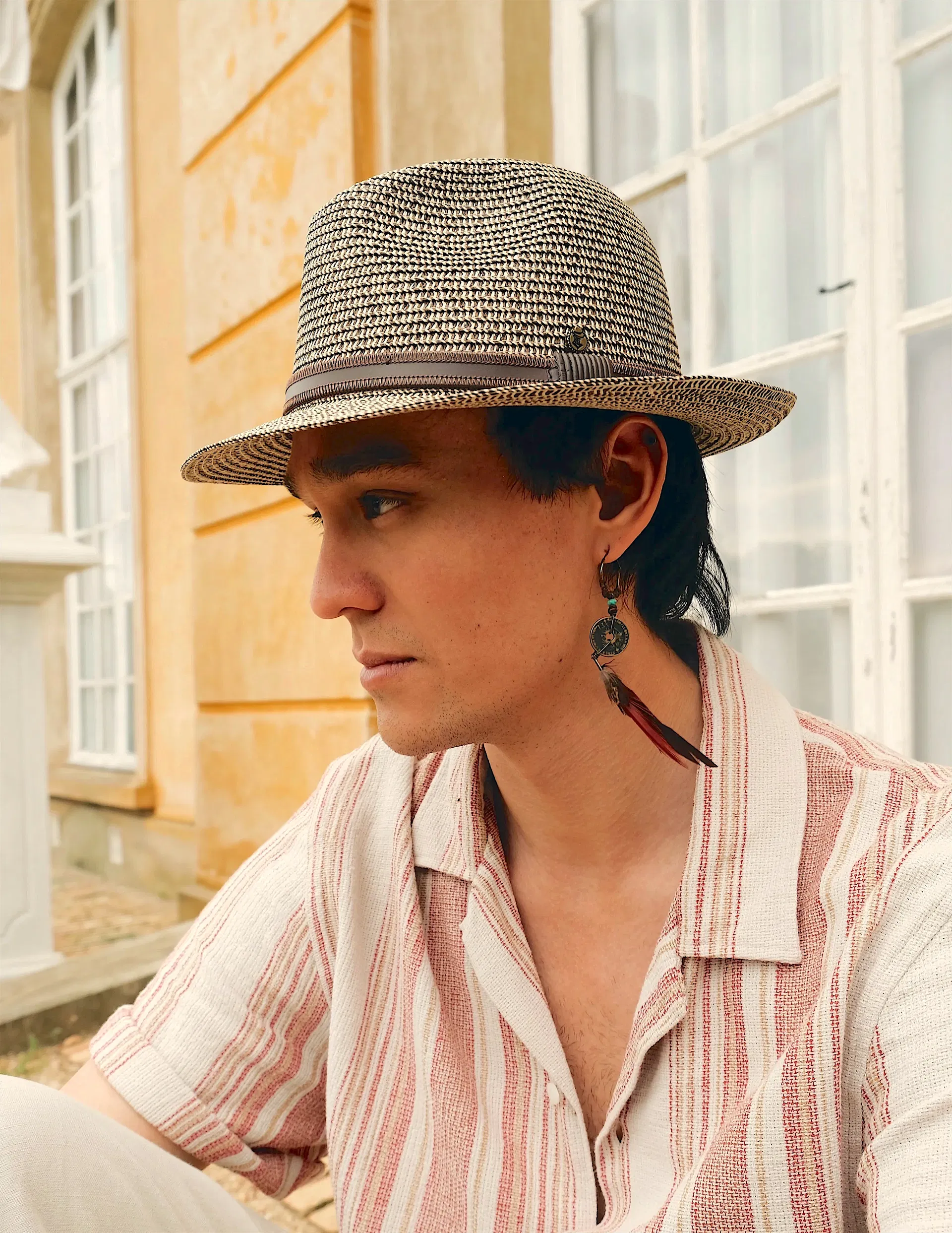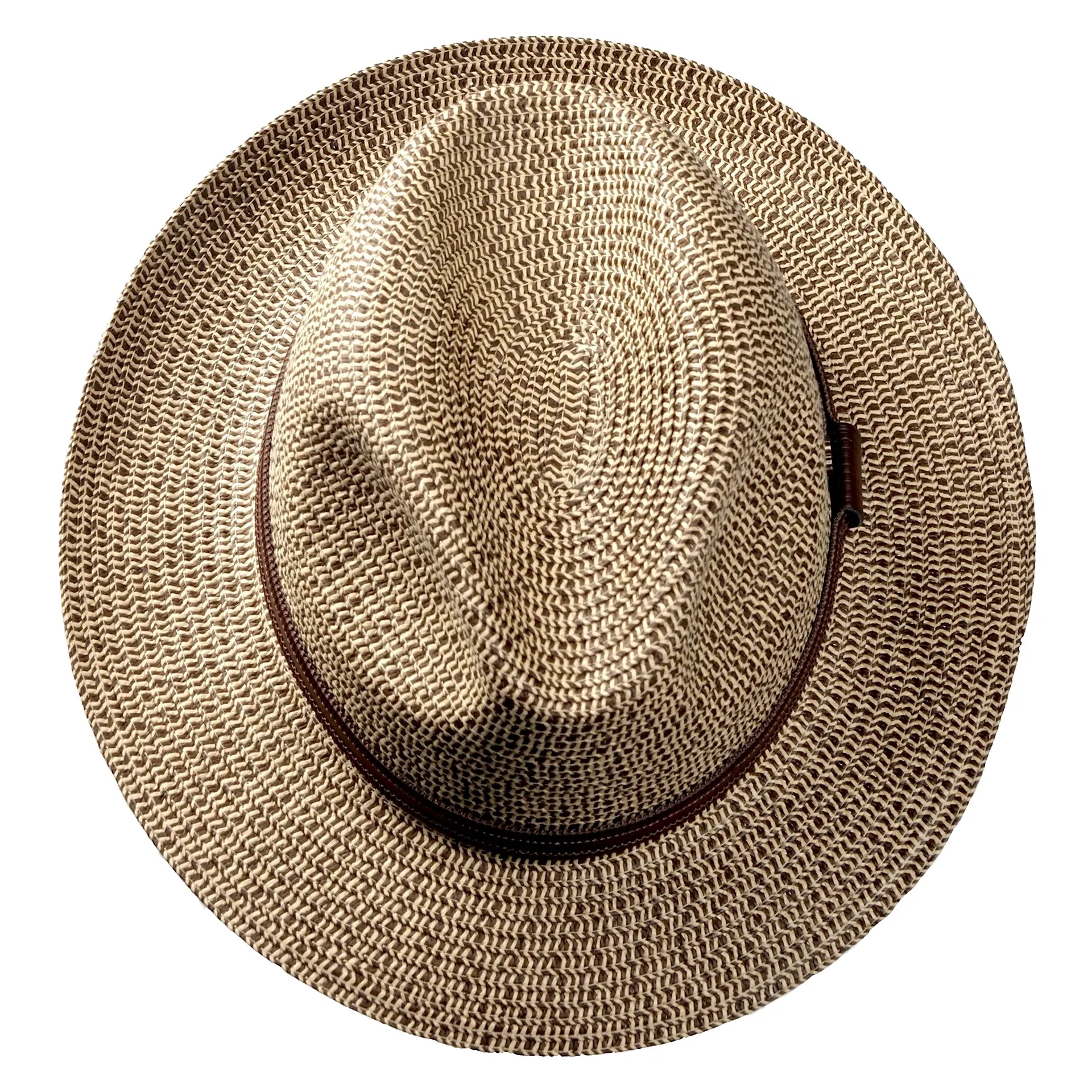 Unisex Fedora Sonnenhut in braun-meliert aus Papierstroh mit fein gearbeitetem, dunkelbraunem Lederband umlegt und maximalem UV-Schutz.